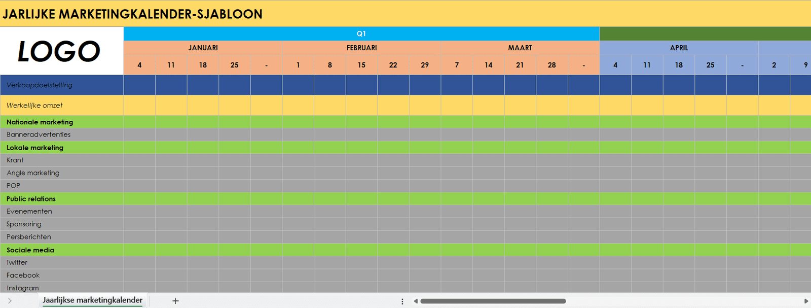 Wil je jouw marketingplanning overzichtelijk en professioneel aanpakken?Download dan nu deze Jaarlijkse Marketingkalender in Excel en begin vandaag nog met gestructureerd plannen.