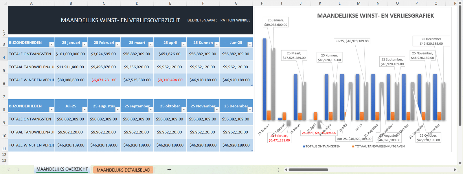 Vul je verkoopgegevens, gemaakte kosten en overige uitgaven in de daarvoor bestemde velden in. Het sjabloon berekent automatisch de totalen en geeft inzicht in winst en verlies. Dankzij de overzichtelijke structuur en grafieken kun je snel financiële beslissingen nemen.
